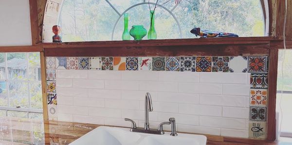 4.5 Acres of Palmettos and Tall Pines, Immediately got the 70's vibe but after a summer of embracing its charm we decided to do some major much needed upgrades and updated the trailer, kept the rustic rough cut pine flooring but had to pull them up, plane them and lay them back down. We painted the walls to brighten it up, embraced the wallpaper in the bathrooms, and completely upgraded kitchen with real wood cabinets and a butcher block island .