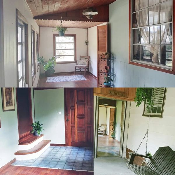 My Twin did the bones of this project. Took him a year as he is an engineer (wink) and I did the cosmetics. An awesome couple moved in and have since started a beautiful family..They even have chickens..they are at home here among the Azaleas.