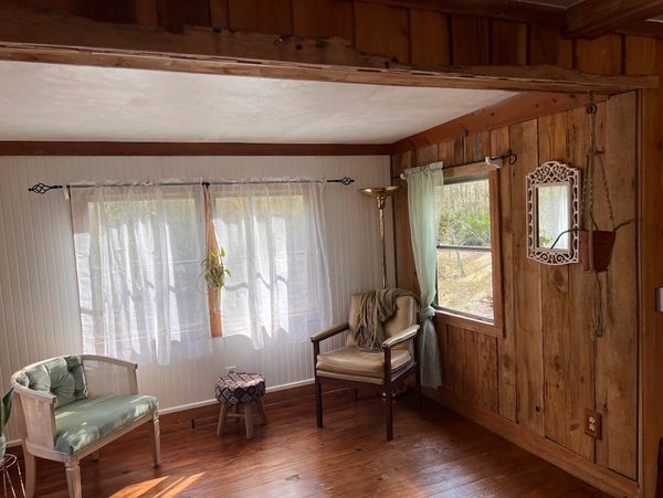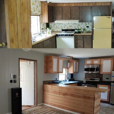 1950's single wide mobile home had a lot of vintage flare to it. We upgraded it with unique one of a kind locally harvested wood paneling, refurbished kitchen cabinets, upgraded porches and much more.